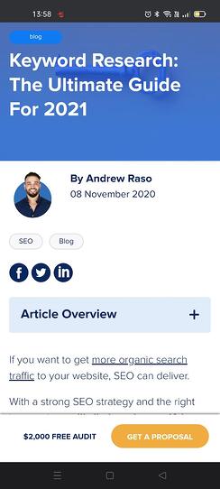 If we then navigate to the same page on a mobile device, we are still on the URL: “https://staging-adam.onlinemarketinggurus.com.au/blog/types-of-keywords-keyword-research-seo/”, however, we are served the mobile version instead: