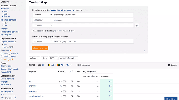You can also conduct a gap analysis for keywords in other tools, such as Moz: